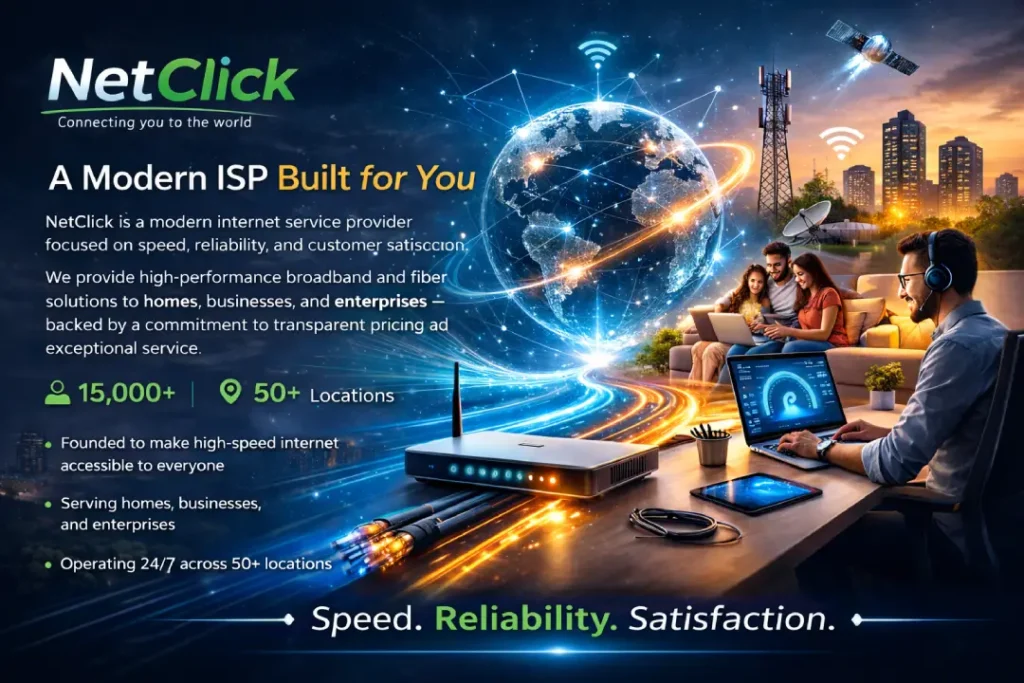 NetClick is a modern internet service provider focused on speed, reliability, and customer satisfaction. We provide high-performance broadband and fiber solutions to homes, businesses, and enterprises — backed by a commitment to transparent pricing and exceptional service.